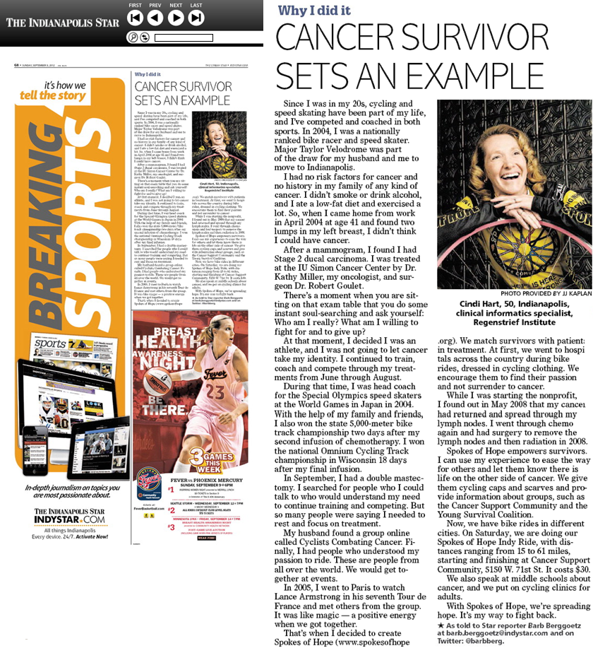 Cindi is cover story for Indianapolis Star and Cancer Survivorship. 04/09/2006