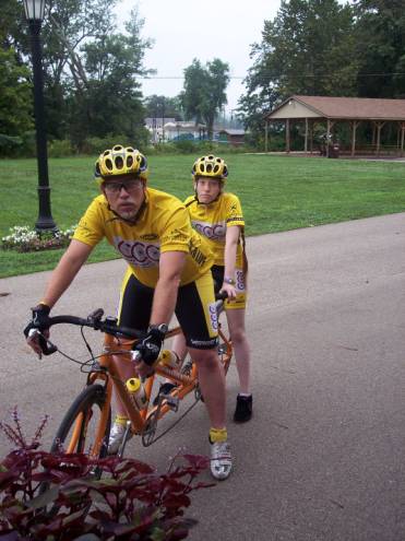 Ken and Madison on Tandem, Jan and I helped lead out the adventure. It wasn't far at all till we found ourselves on a gravel covered "tow path". It was part of the Cleveland metro-parks trail system, and was part of the Ohio-Erie canal trail The gravel was fine, but it had been raining over night, so there were all kinds of puddles around. We were speckled from head to toe (and up the back) in no time at all.