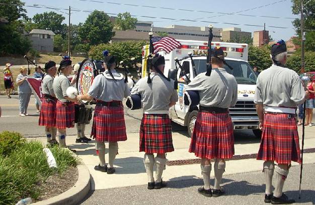 Hamilton County Police & Fire, Pipe and Drum Corp play at the finish. Cindi’s father is left of the Bass Drum